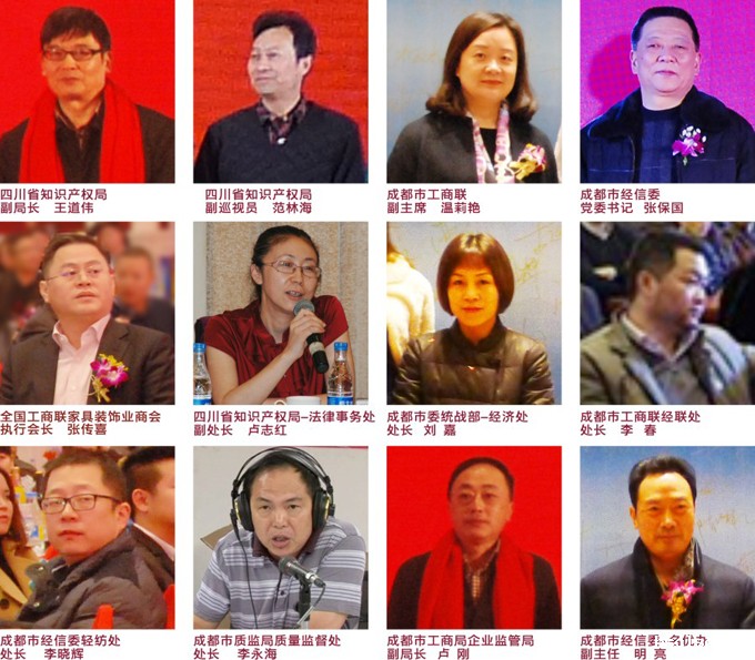 四川省知识产权局副局长王道伟、四川省知识产权局副巡视员范林海、成都市工商联副主席温莉艳、成都市经信委党委书记张保国、四川省知识产权局法律事务处副处长卢志红、成都市委统战部经济处处长刘嘉、成都市工商联经联处处长李春、成都市经信委轻纺处处长李晓晖、成都市质监局质量监督处处长李永海、成都市工商联副秘书长韩路贤、成都市工商局企业监管局副局长卢刚、成都市经信委名优办副主任明亮、成都市质检院副院长余宏等省市党政部门领导出席大会。中国家居界行业领导——全国工商联家具装饰业商会执行会长张传喜也光临年会,到场祝贺。