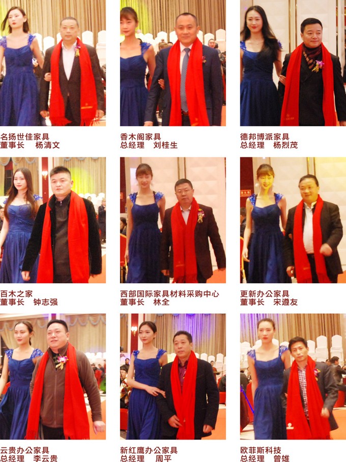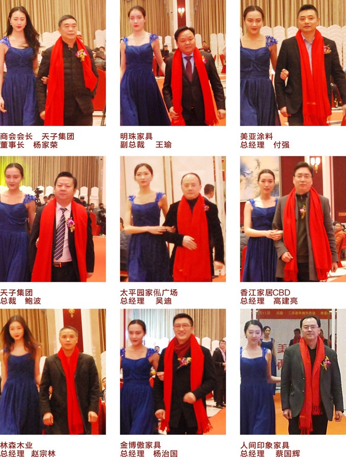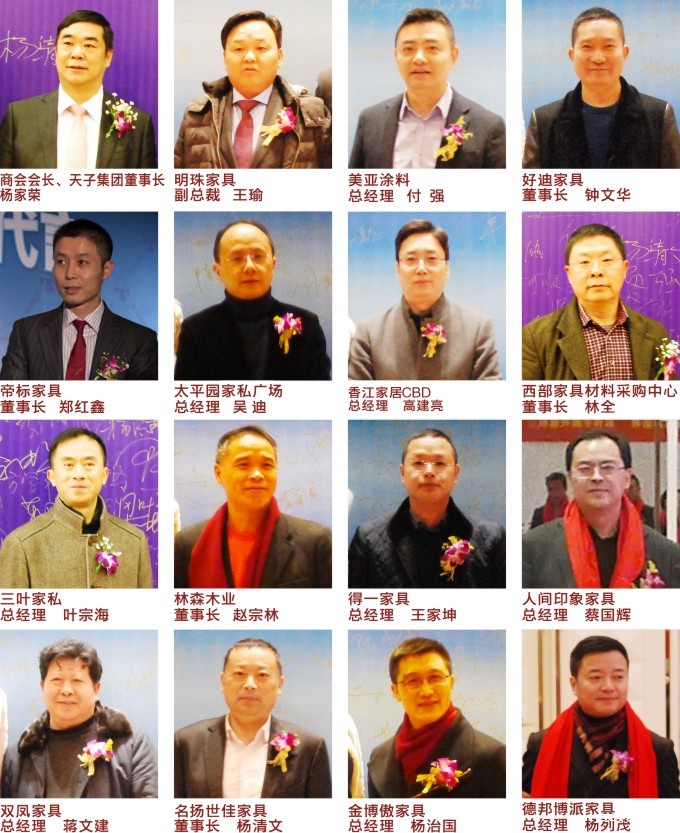 商会会长、天子集团董事长杨家荣、明珠家具副总裁王瑜、好迪家具董事长钟文华、帝标家具董事长郑红鑫、三叶家私总经理叶宗海、阳光林森董事长赵宗林、得一家具总经理王家坤、太平园家俬广场总经理吴迪、香江CBD总经理高建亮、大家得材料市场董事长林全,以及双凤、名扬世佳、金博傲、森达博轩、人间印象、香木阁、德邦博派、帝安姆定制、莱茵艾格定制、韩居丽格定制、更新办公、创新办公、云贵办公等成都家具行业材料配件、民用家具、定制家居、办公家具、家具卖场企业老总欢聚一堂,共迎新春。